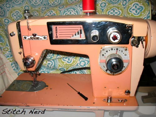 I am sure that this was a very nice light pink sewing machine when it was new but now the "pink" just looked like a boring salmon-y color. I had some epoxy paint remover in my garage and decided to strip it and repaint it a color you do not normally see on sewing machines.